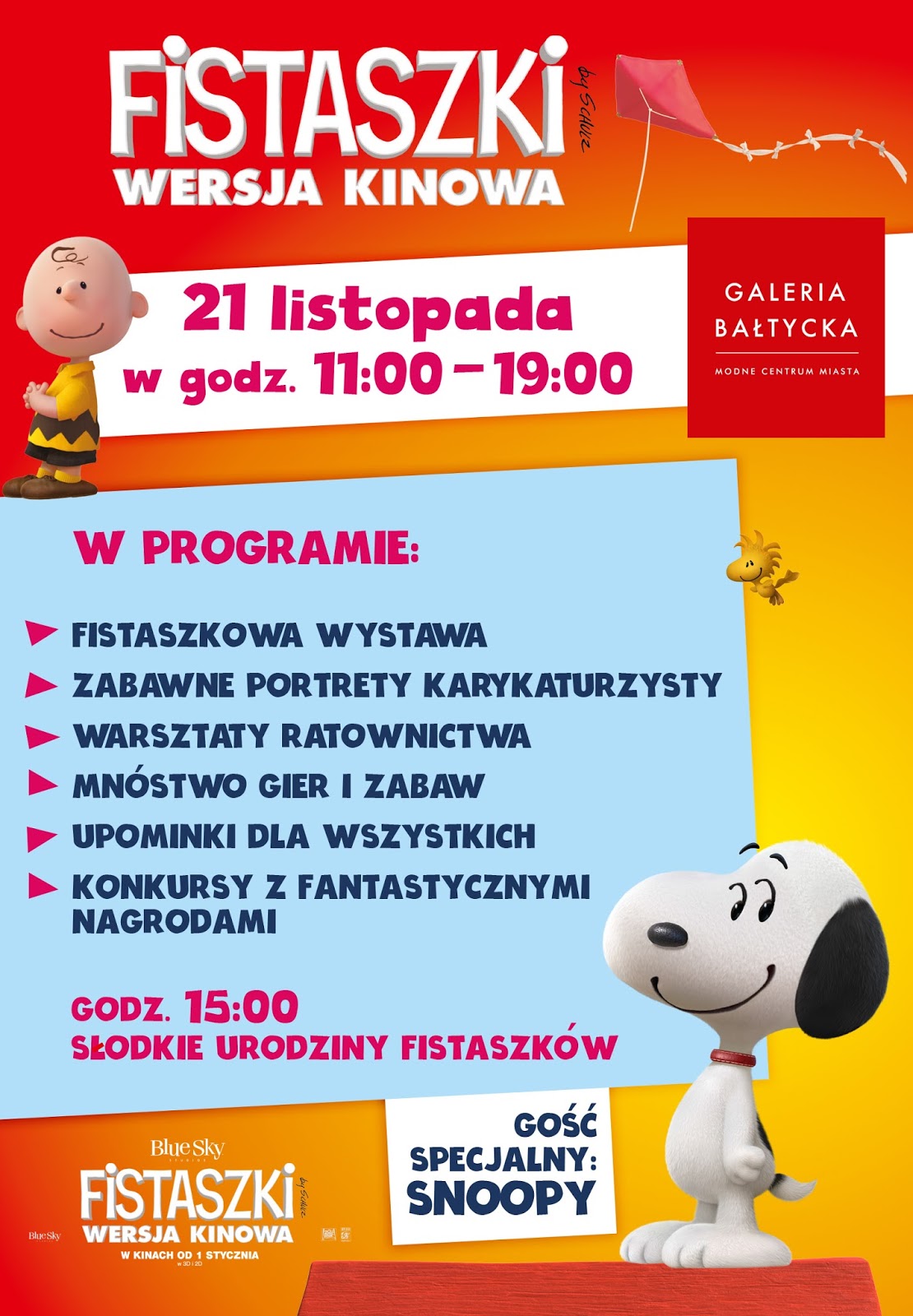 W najbliższą sobotę po raz kolejny będziemy obchodzić urodziny Fistaszków i psa Snoopy’ego! Serdecznie zapraszamy do Gdańska do Galerii Bałtyckiej, gdzie z okazji premiery filmu "Fistaszki - wersja kinowa" organizowane będą super imprezy dla dzieci. Jeżeli macie chwilę koniecznie zabierzcie swoje pociechy. Zabawa trwa od godz. 11.00 do 19.00. Życzymy dobrej zabawy!